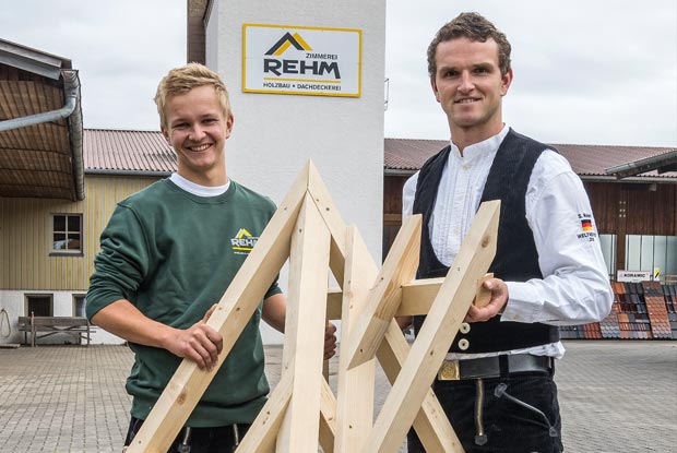 Gibt sein Wissen gerne weiter: Simon Rehm (r.) hat Bayerns besten Nachwuchs-Zimmerer 2020 Niklas Grad ausgebildet. Außerdem ist Rehm zweiter stellvertretender Teamleiter der Zimmerer-Nationalmannschaft.