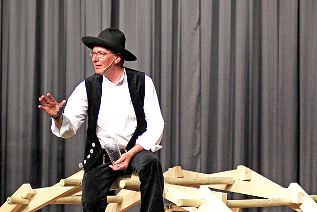 Bereits im dritten Jahr in Folge hat Zimmermeister Richard Betz sein Ein-Mann-Theaterstück „Mit Herz und Hand“ an bayerischen Schulen aufgeführt. 2018 sahen ihn dabei an 28 Mittel- und Realschulen fast 4000 Schüler.